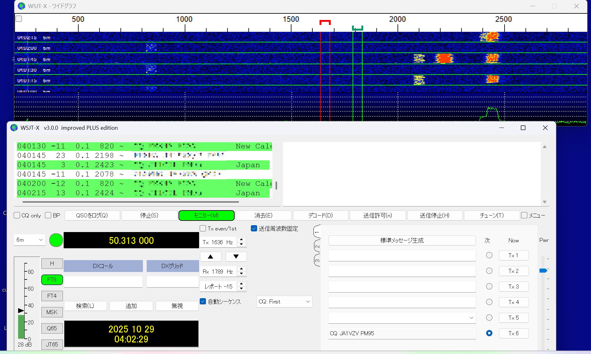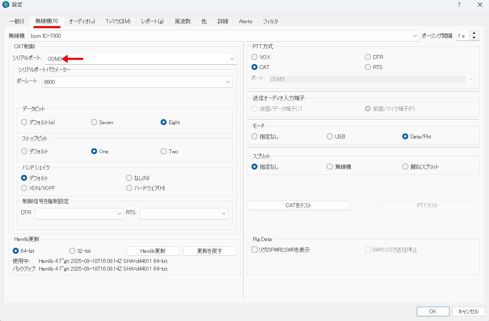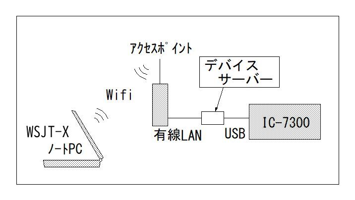 5 WSVT-XにI/Oエラーが発生 モニター状態で見ていると周波数表示左横の●が一時●になり●に戻ることがありました。 WSJT-XのI/Oエラーが一時的に生じている様です。 稀に●に戻らずに再設定や再試行を要求するダイアログが出て動作が止まることもあります。 "SX Virtual Link"は接続状態を維持しているので、転送遅れなどで応答がすぐに得られないことがあるのかもしれません。 停止に至る症状は数時間見ていても現れないこともありますし、PCで他のアプリを使っていると出やすくなるようです。 止まっても"再試行"をワンクリックすれば復旧できます。 送信中にエラーになるかは長時間運用してないので未確認です。 問題は残ってますが家の中の何処からでもでFT8が使えるようになったのは有難いことです。 I/Oエラー改善? CATの通信速度を38400bps*にしたところPCで他の作業をしていてもエラーが出なくなりました。 完全に解消できたのかは分かりませんが良い傾向です。 変更した箇所は ・WSJT-X CAT通信速度 ・IC-7300 CI-V通信速度 ・VSPE IC-7300接続ポートの通信速度 ・PCのシリアルポート 通信速度 *IC-7300とリンクしているTurboハムログの通信速度が38400bpsまでなので、この速度に設定しています。 6 実験に使った機材など PC WIndows11 CPU:i5-12450H(2GHz) RAM:16GB デバイスサーバー用クライアントアプリ "SX Virtual Link" v5.2.1 WSJT-X v3.0.0 Improved plus Edition Icom用ドライバー v1.20 Wifi IEEE 802.11ax LAN 1000Base-T デバイスサーバー I/Oデータ ETG-DS/US TRX IC-7300M (ファームウエアV1.42) +ダミーロード 7 遠隔操作の申請手続きについて調べました 今回の実験システムは自宅内のLANを利用していますので「一の構内で行われるアマチュア局の無線設備の遠隔操作の特例」により申請不要で使用できるとのことです。 送信機の遠隔運用について下記に説明がありました。 出典:総務省ホームページ https://www.tele.soumu.go.jp/j/others/amateur/confirmation/remote_control/index.htm  |