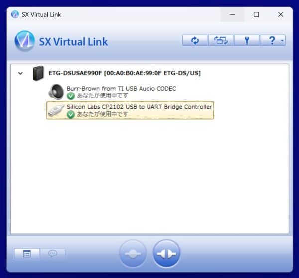 2 デバイスサーバーの設定 工場出荷状態ではLAN側のIPアドレスはDHCP機能で自動取得しますので、ネットワーク中にDHCPサーバーがあればデバイスサーバー自体はつなぐだけで使える様になります。 固定IPアドレスに変える場合はブラウザでデバイスサーバーのアドレスにアクセスするかセットアップユテリティー(後述)を使って行います。 設定時にIDとパスワードを要求されますが、初期値は"root"、パスワード無しです。 3 PCの設定 PCにはリモート側のUSBと接続するためのクライアントアプリをインストールする必要がありますが、ETG-DS/US付属のアプリ(クライアント用とデバイスサーバー設定用)がWindows10/11では正常に動作しません。 ネット記事を探したところ、この機種はSilexのOEMなので"SX Virtual Link"(クライアントアプリ)が使えるという情報が見つかりました。 手持ちのC-6600GBの実した際にSilex社のサイトから"SX Virtual Link"の最新版と"Devicw Server setup"(デバイスサーバー設定アプリ)を入手していましたので、これらを使用することにしました。 デバイスサーバーにIC-7300を接続して"SX Virtual Link"を開き、Codecと制御ポートに接続するとこの表示になります。